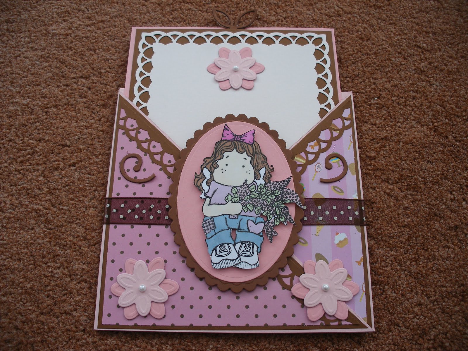 The image is a Magnolia stamp coloured in with Promarkers. I have stuck onto oval and scalloped oval with 3d foam pads to raise off the card. The brown spotty ribbon was from a reel I bought at WS Designs at the Newbury craft show.